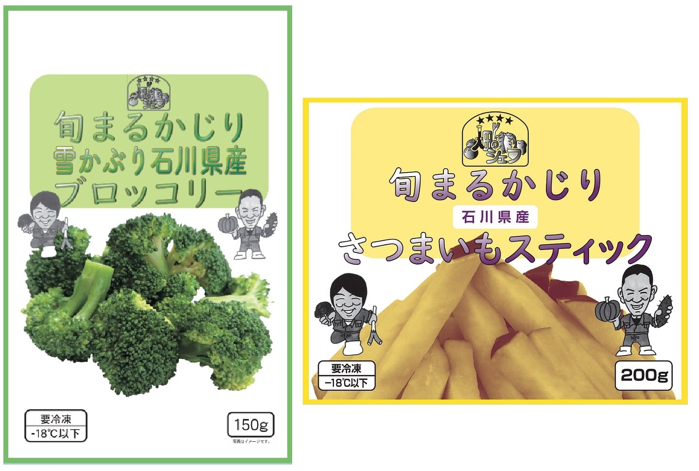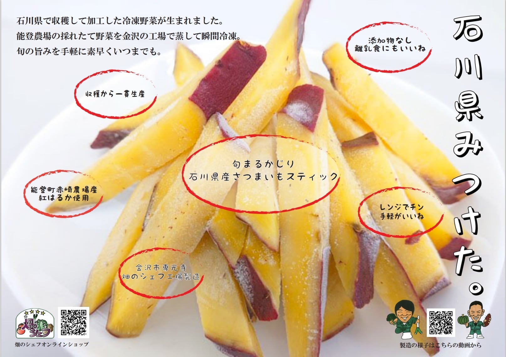 能登の真っ赤な土と風土がうまさを底上げしてはぁとため息がでる美味しさです。ブロッコリーは雪下から収穫し食べやすい大きさに、さつまいもはスティック状に、それぞれ切ったものを蒸し上げて急速冷凍することで旬のうまみをいつでも楽しめるようにしました。